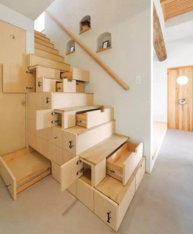 像一些小復式的戶型,室內都會設置樓梯,這樣完全可以把樓梯底下的空間設置成收納。甚至有些業主就按照樓梯的形狀來定制柜子或者架子,有些則是直接把臺階之下的空間做成抽屜。