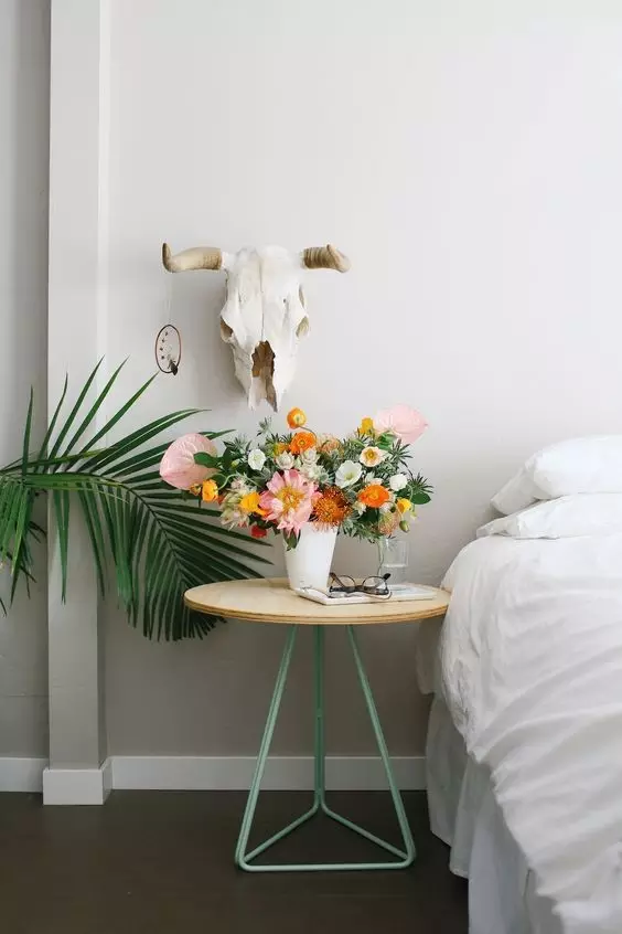 一把小椅子當作床頭柜,再擺上五彩繽紛的植物就趣味十足